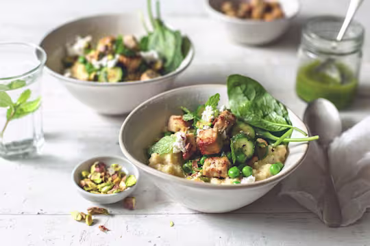 - Top each serving of polenta with some of the Quorn Pieces and zucchini mixture, baby spinach, ricotta and pistachios. Drizzle the chive oil on top and add a few mint leaves, if preferred.