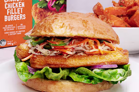 - Prepare the Quorn Crunchy Chicken Fillet Burgers as per packet directions.