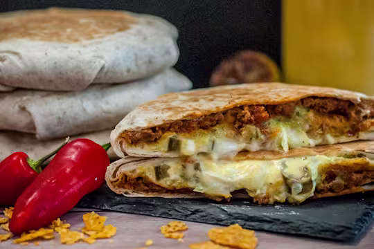 - To assemble the crunch wrap lay out a large tortilla, spread a layer of chipotle mayo and top with the Quorn Mince mixture. Top with a layer of tortilla chips, guacamole, sour cream, jalapenos and cheese.