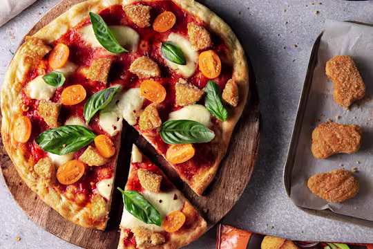 - Cook pizza base in the oven for 10 mins, then add Quorn Vegan Nuggets and bake for a further 5 mins, or until the cheese has melted.