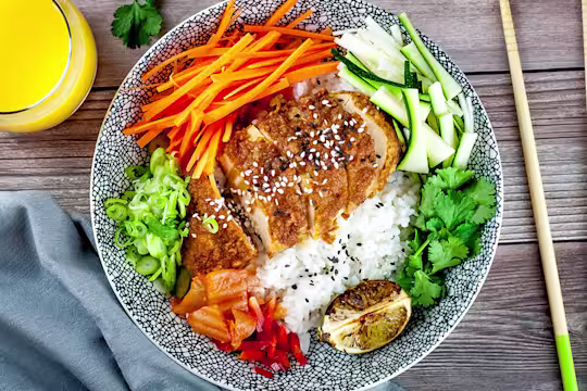 - Top the sticky rice with sliced Quorn Crunchy Chicken Fillet Burger, grated carrot and a handful of pea shoots. Spoon the remaining teriyaki sauce over the fillet and garnish the sliced spring onion and sesame seeds.